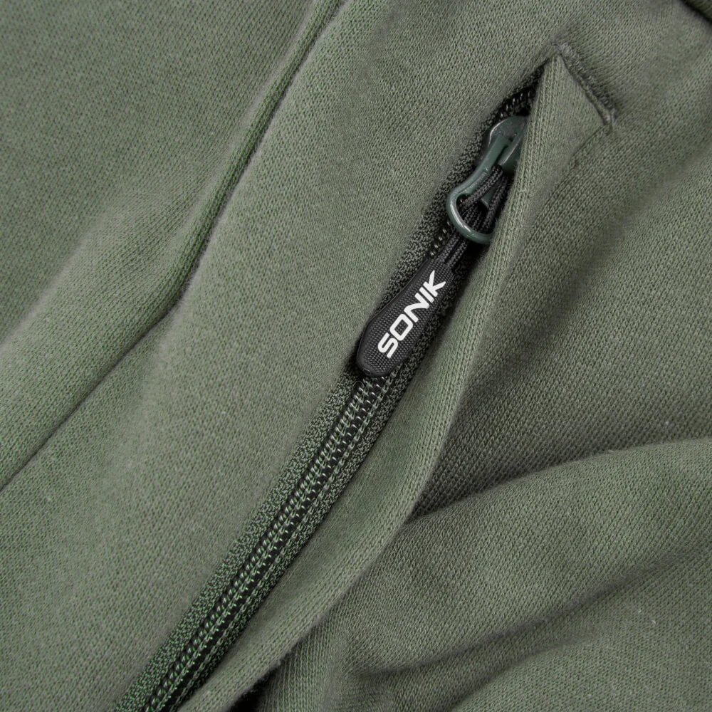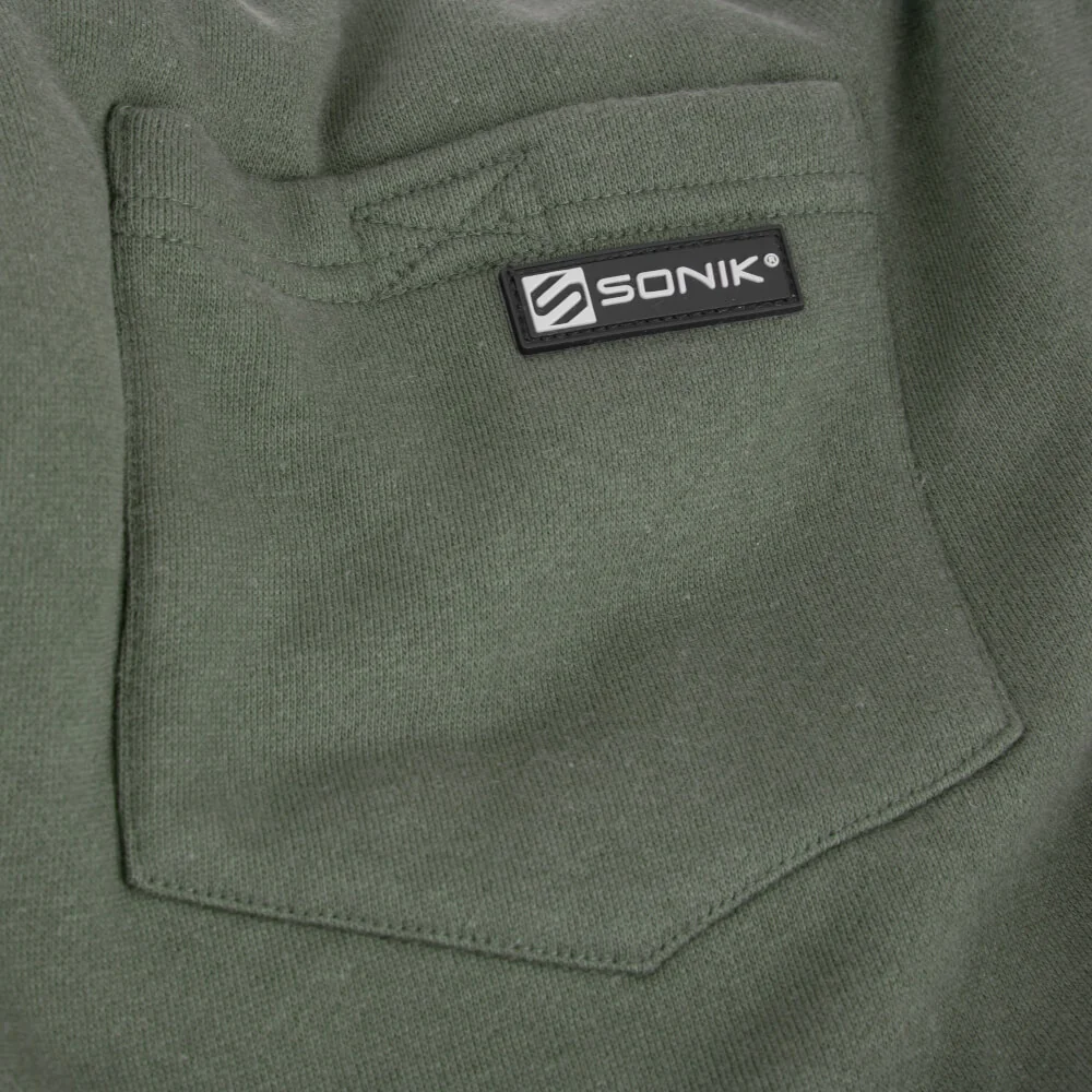 Die Sonik Jogger Green ist stilvoll, bequem, sehr praktisch und aus einem dreifädigen Fleece gefertigt, 300 g/m² bestehend aus 80 % Baumwolle und 20 % Polyester, das für Wärme und Komfort sorgt. Zu den zusätzlichen Merkmalen gehören ein elastischer Bund mit Kordelzug, ein Beinlogo, eine Gesäßtasche und Seitentaschen mit Reißverschluss. Erhältlich in vier Größen, Medium, Large, XL und XXL.